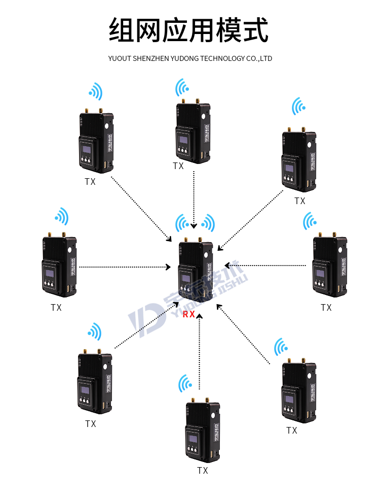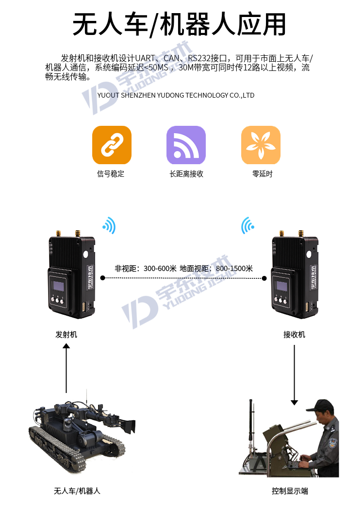 YDTD8000宇東視頻數據無線圖傳系統采用工業級無線高速率數據傳輸技術,非視距,非WIFI,集合正交頻分復用時分多址調制及MIMO多進多出容量技術,完全基于IP互聯網協議,實現全雙向透明通道寬帶傳輸。非視距:300-600米;地面視距:800-1500米;空對地:5000米。系統為純硬件連接,即插即用;創新性液晶一體化設計、豐富的CAN總線、RS-232、TTL電平接口,更好的用戶角度體驗。通道最大支持30Mbps吞吐量,可廣泛應用于工業自動化、工業機器人、無人機、視頻監控等通信工作。